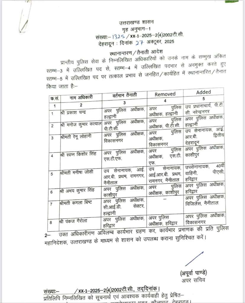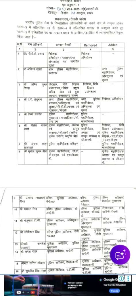 16 IPS और 8 PPS अधिकारियों का ट्रांसफर, SSP नैनीताल बने मंजूनाथ टीसी
