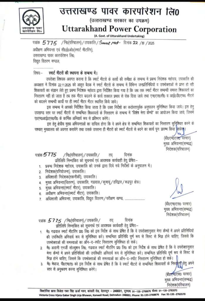 देहरादून। स्मार्ट मीटरों को लेकर लगातार मिल रही शिकायतों के बाद ऊर्जा निगम ने बड़ा फैसला लिया है। प्रबंध निदेशक, उपाकालि की अध्यक्षता में 22 नवंबर 2025 को हुई समीक्षा बैठक में निर्देश जारी किए गए कि जब तक स्मार्ट मीटरों से जुड़ी सभी शिकायतें पूरी तरह निस्तारित नहीं हो जातीं, तब तक मीटर बदलने का कार्य तत्काल प्रभाव से रोक दिया जाए।