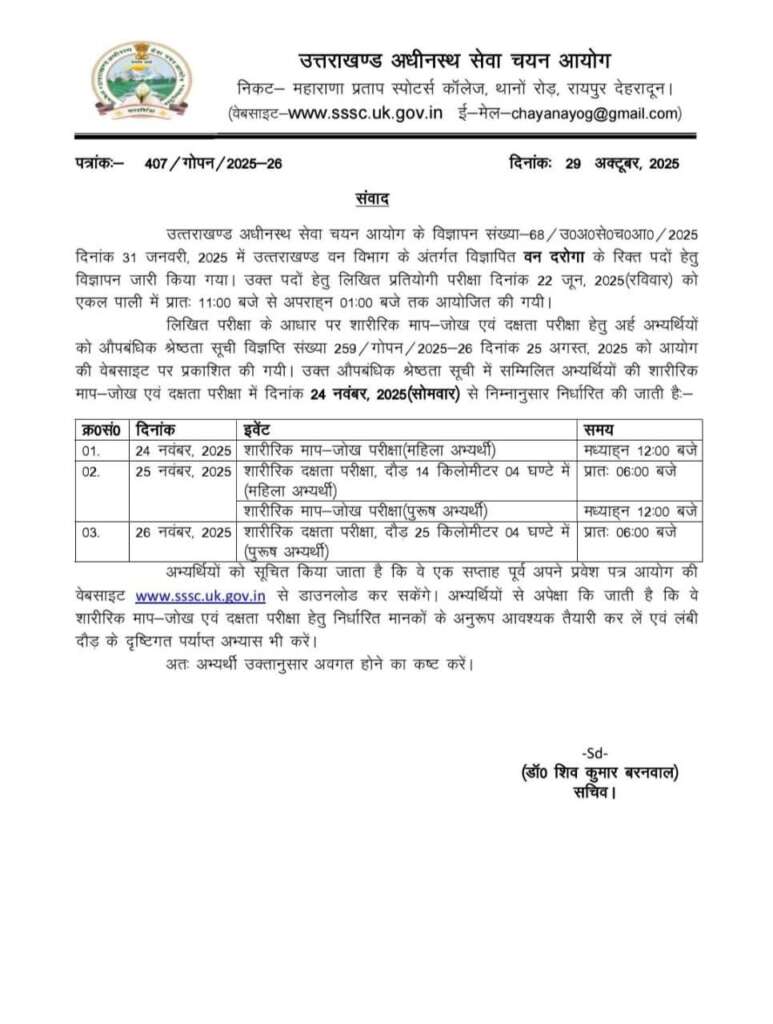 उत्तराखंडः(बड़ी खबर)-UKSSSC ने जारी की वन दरोगा भर्ती की नई तिथि